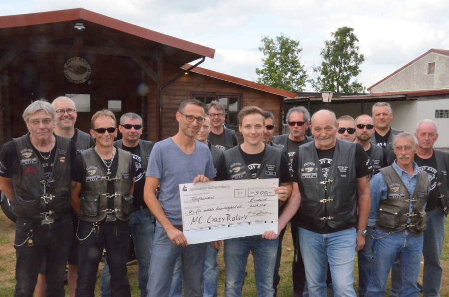 Die Scheckübergabe bildete den Auftakt zum diesjährigen Sommerfest der „Rats". Bis in die frühen Morgenstunden feierten die 17 Männer zusammen mit etlichen Abordnungen befreundeter Motorradclubs sowie mit Freunden und Bekannten aus Lindhorst und Umgebung. „Das war wieder einmal ein Riesending", freute sich MC – Secretary Frank Schier über das gelungene Fest auf dem vereinseigenen Gelände neben dem Schützenhaus. Foto: bt
